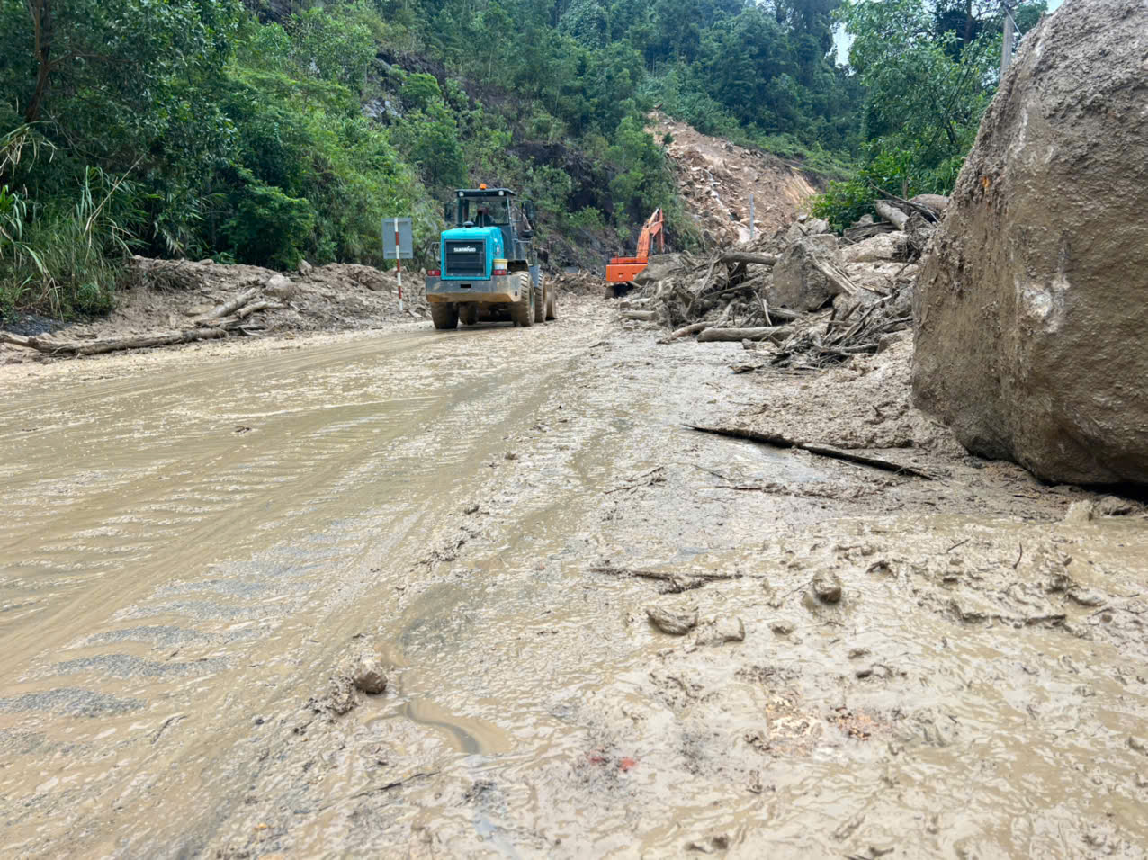 Sau mỗi đợt nổ mìn, hàng chục máy móc cơ giới, bao gồm máy xúc lật, máy ủi và xe ben, được huy động tối đa công suất, luân phiên hót dọn, vận chuyển hàng ngàn mét khối bùn đất, đá sạt lở ra khỏi lòng đường.